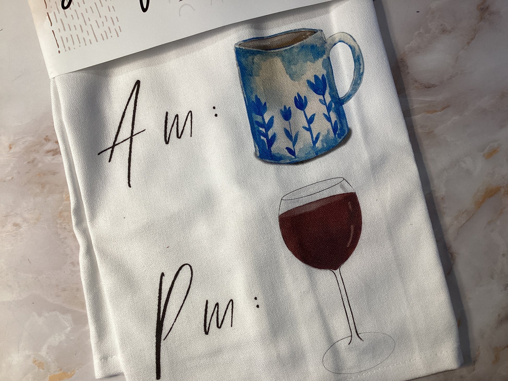 This beautiful towel features a watercolor coffee cup paired with AM and a wine glass paired with PM. It’s such a great addition to your kitchen or a hostess gift.