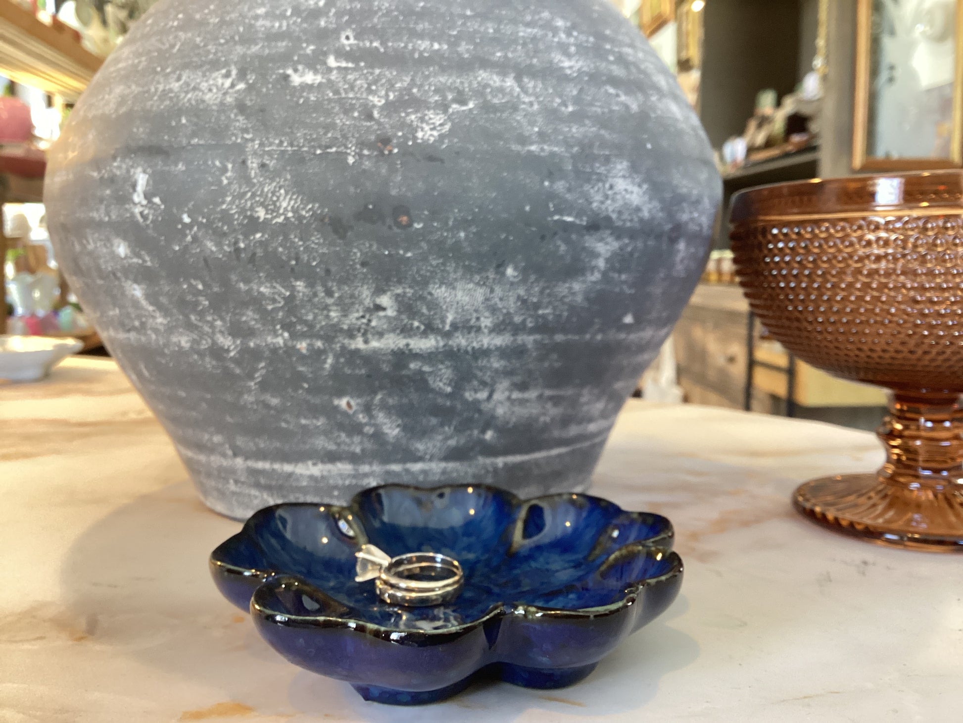 This ceramic flower dish features beautiful, deep, rich midnight and navy blues. It is finished off with a lovely gloss that catches the light wonderfully. Each dish is similar with its own unique flair making it a one of a kind. This is the spot you are looking for on your nightstand to put your rings, earrings, or hand cream. This dish is great to keep for yourself or to gift.