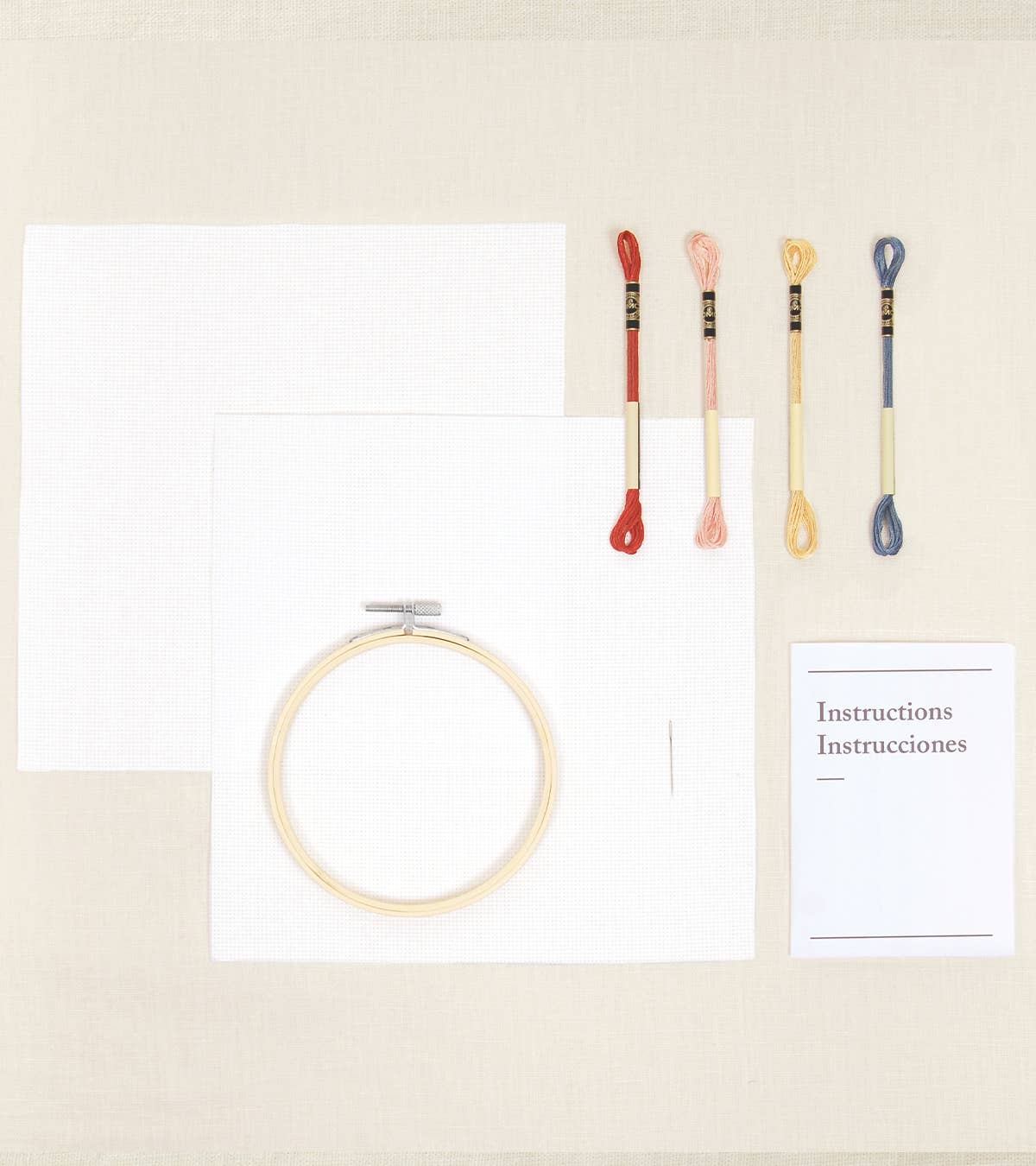 This Kit Includes 4 Skeins of Embroidery Floss (2m), 14 Ct Aida (100% Cotton) 8.7in X 8.7in, Embroidery Needle, Wooden Embroidery Hoops, 5.3in, Instructions, Design Size 4.9in X 4.9in and 4.4inx4.4in.