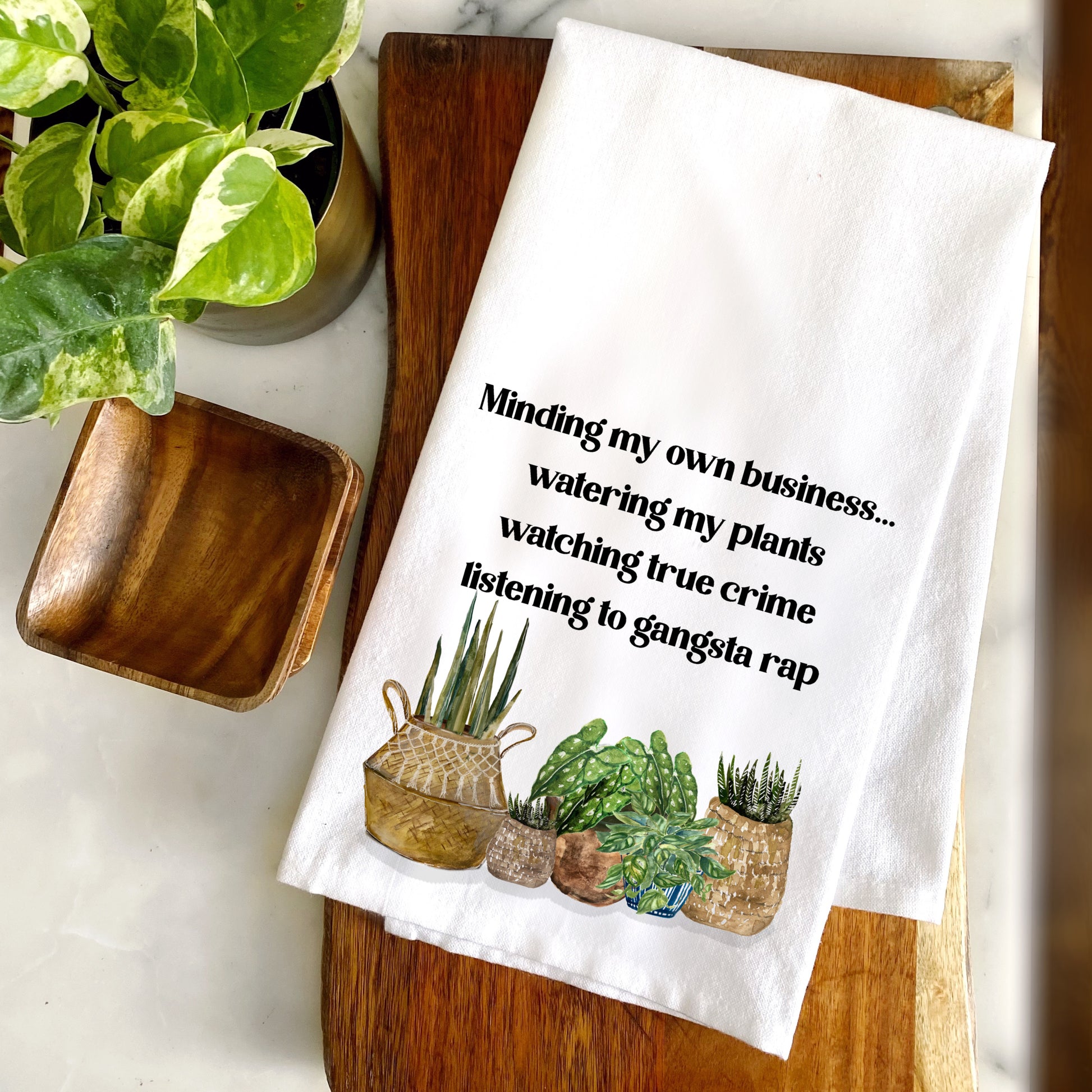 This cute cotton tea towel says "Minding my own business...watering my plants watching true crime listening to gangsta rap" surrounded by plants is a fun accent or perfect gift. Features art with plants in boho baskets such as sanseveria and aloe.