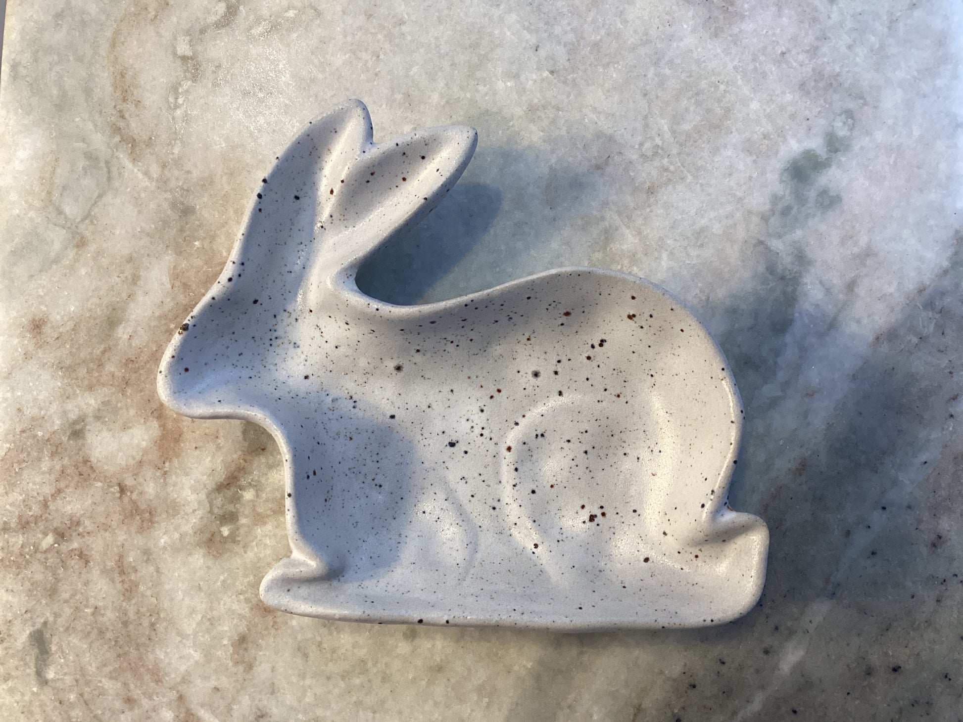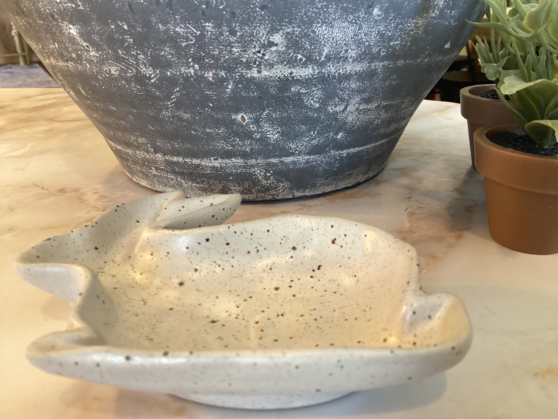 With all things Spring, Easter and bunnies right around the corner this off white speckled bunny dish is spot on. This dish can be used in a beautiful spring table scape, on a bed side table, dressing up a decorative tray or added to a loved ones Easter basket. It is the perfect size for rings, jewelry, loose change or any small trinket.