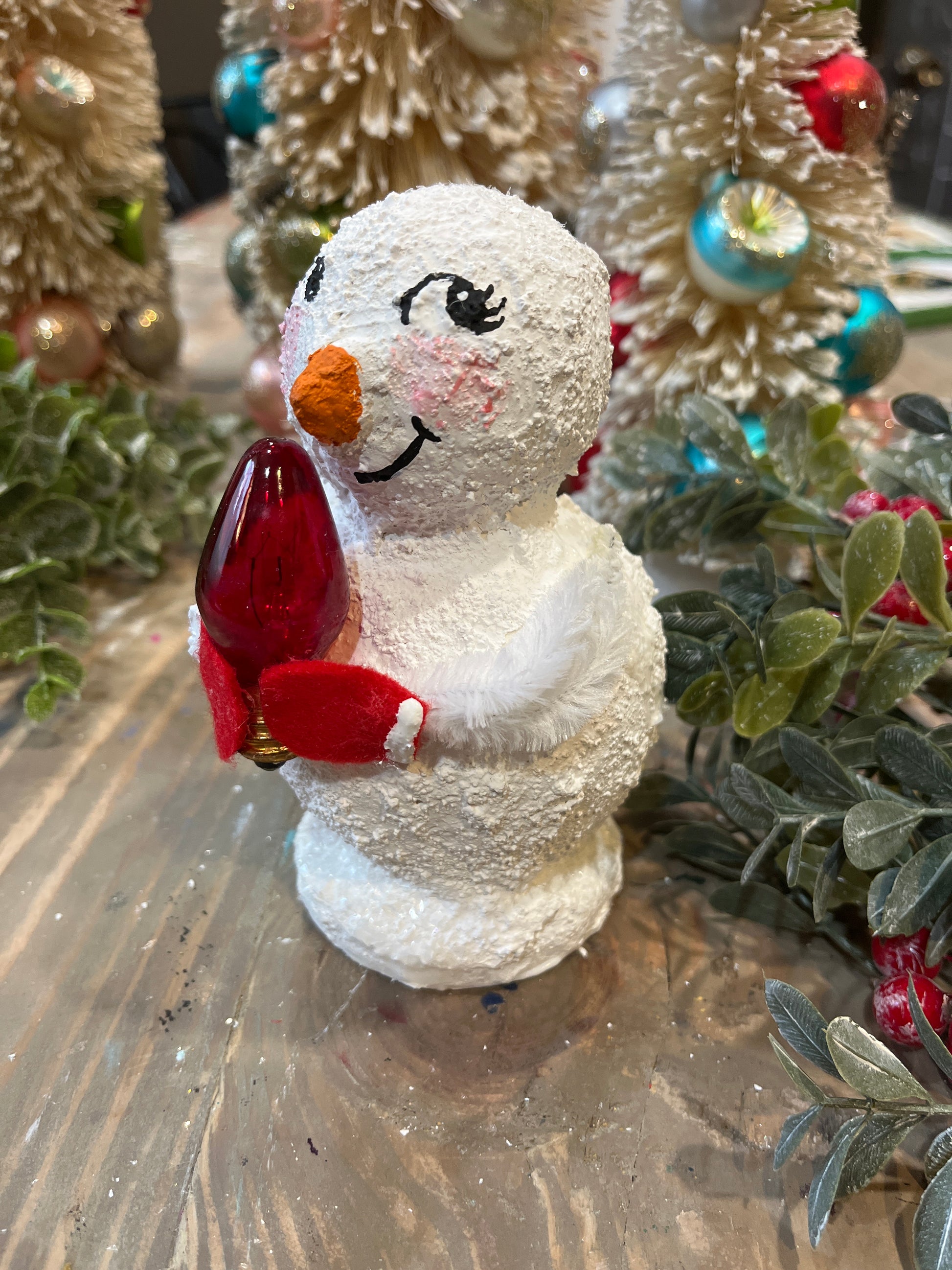 Our handmade snow person is constructed with it's own personality. Each snow person takes approx. 4 hours to create. Named "Harlow" they have a sweet face, pipe cleaner arms and carry and a vintage holiday light bulb in their mittened hands.