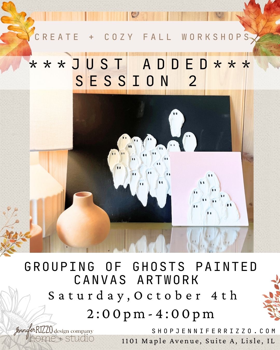 Added second session - It's spooky season! Let's create a fun and viral Tik Tok ghosts texture art painting! Painted on 11 x 14 canvas board, we'll use dimensional medium to create a group of ghosts. Choose a background color and create a fun Halloween decor project. All materials provided. Leave with a completed work of art.