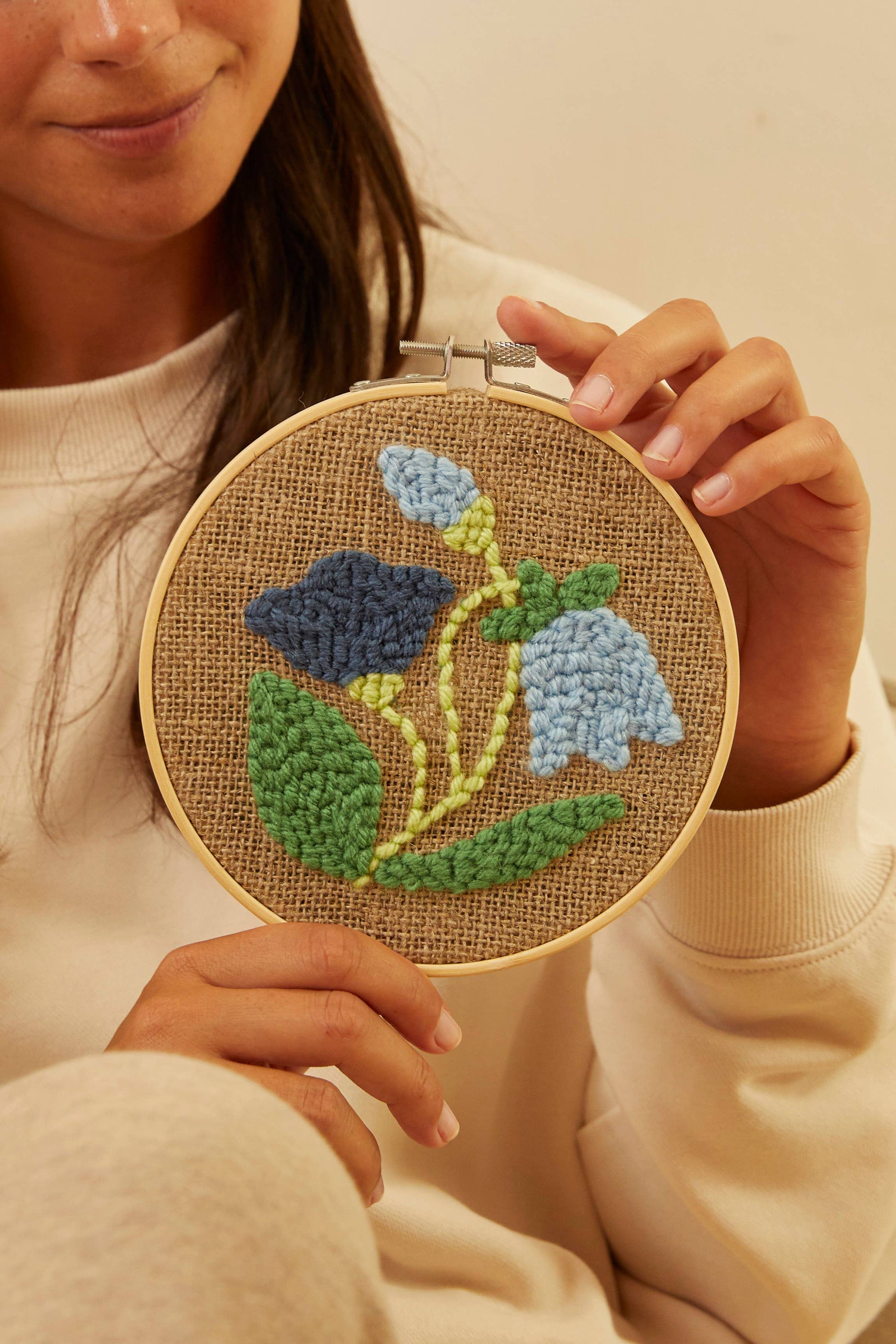Discover a hobby that feeds your soul. Lose yourself in rhythmic making and bring these beautiful blue blooms and green leaves to life. The 100% acrylic yarn in four fresh blue and green hues contrasts with the rustic canvas, making this a bold and tactile design. Designed with beginners in mind, this kit is a great gift to introduce loved ones to the relaxing art of punch needle. Alternatively, you could enjoy the kit yourself and give your finished creations away as gifts to friends and family.