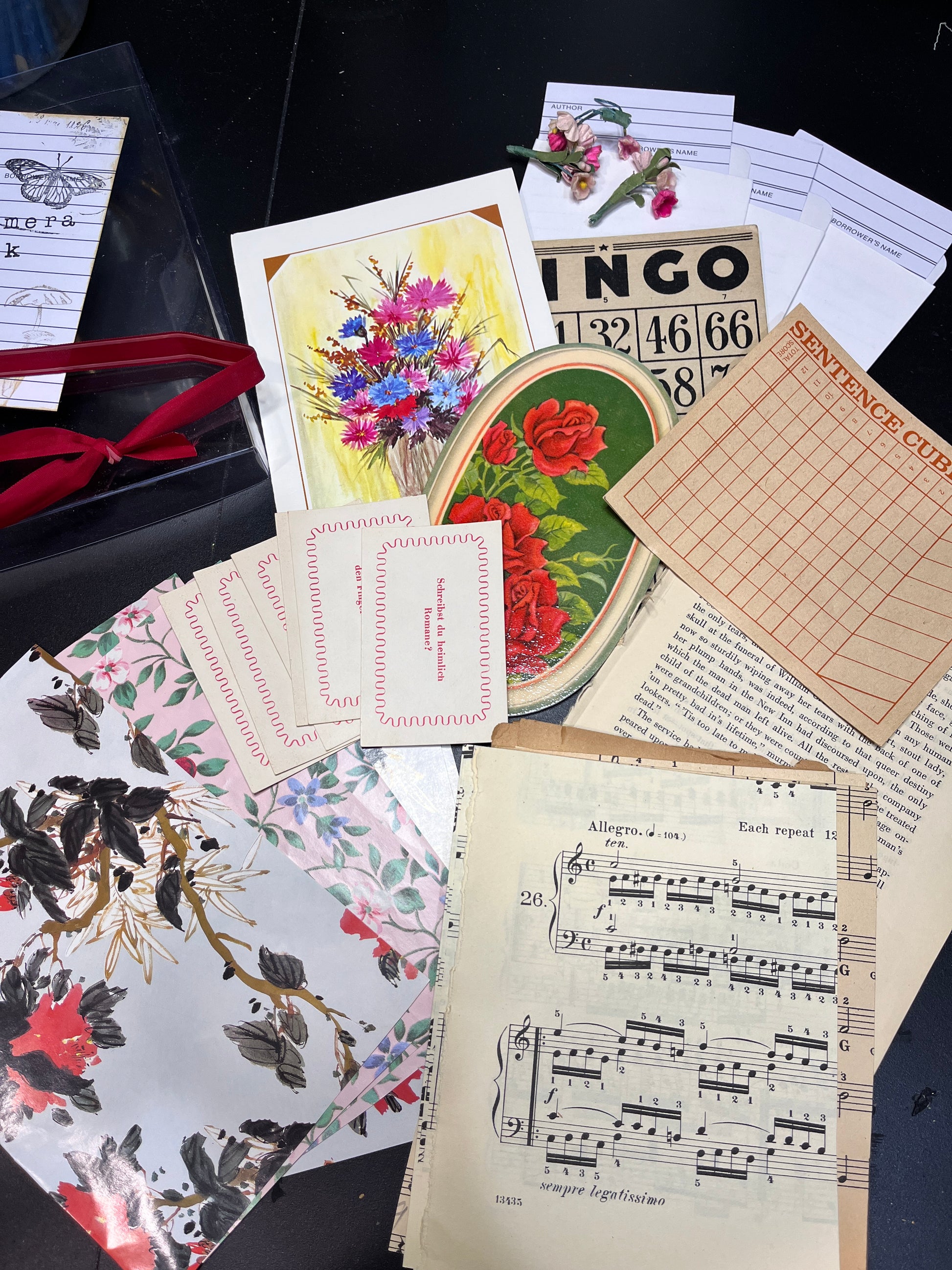 This vintage ephemera pack is perfect for junk, journaling, scrapbooking, or creating mixed media art. It contains old book pages, vintage, sheet music, vintage, wrapping paper, vintage, bingo card, cards from a vintage children’s card game, New Library, check out cards, and more. Everything in the image is included.