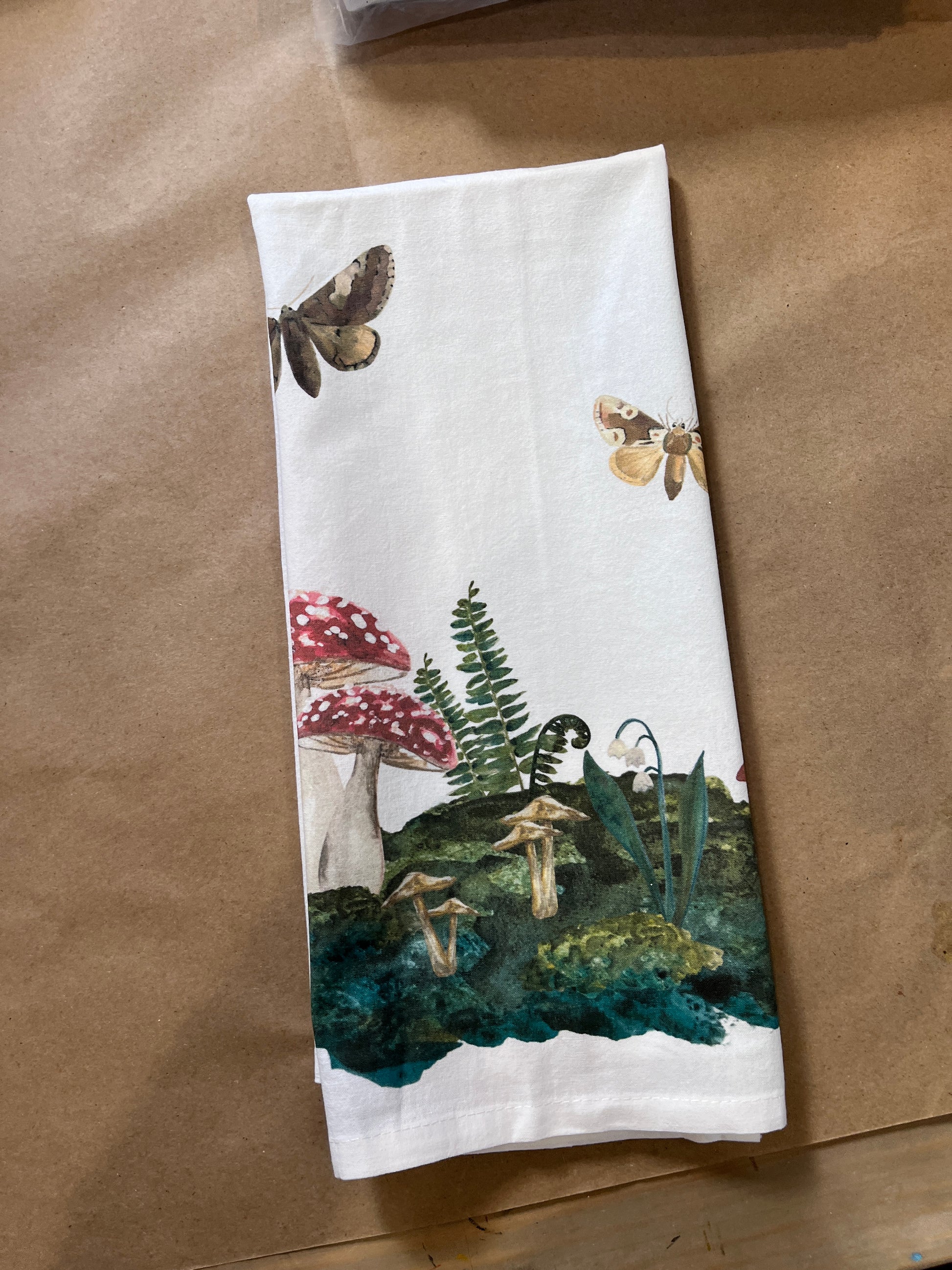 This pretty cotton tea towel features mushrooms,moths, and ferns on a mossy patch.